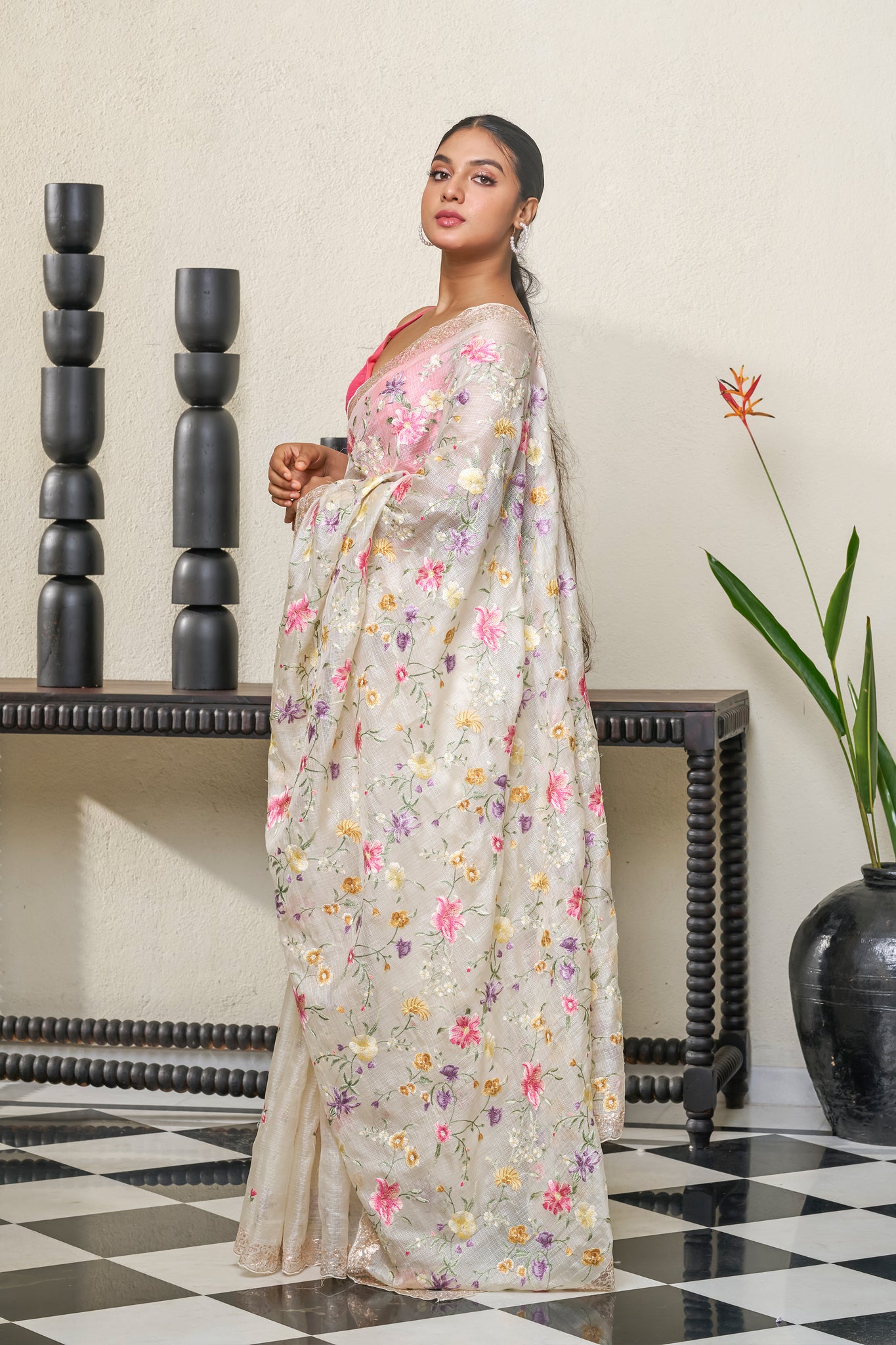 Made from fine Net-Cotta fabric, this off-white saree exudes effortless elegance. Adorned with all-over floral embroidery on the body and pallu, it showcases classic artistry and delicate charm. Lightweight and refined, it’s an ideal choice for festive occasions and special gatherings.