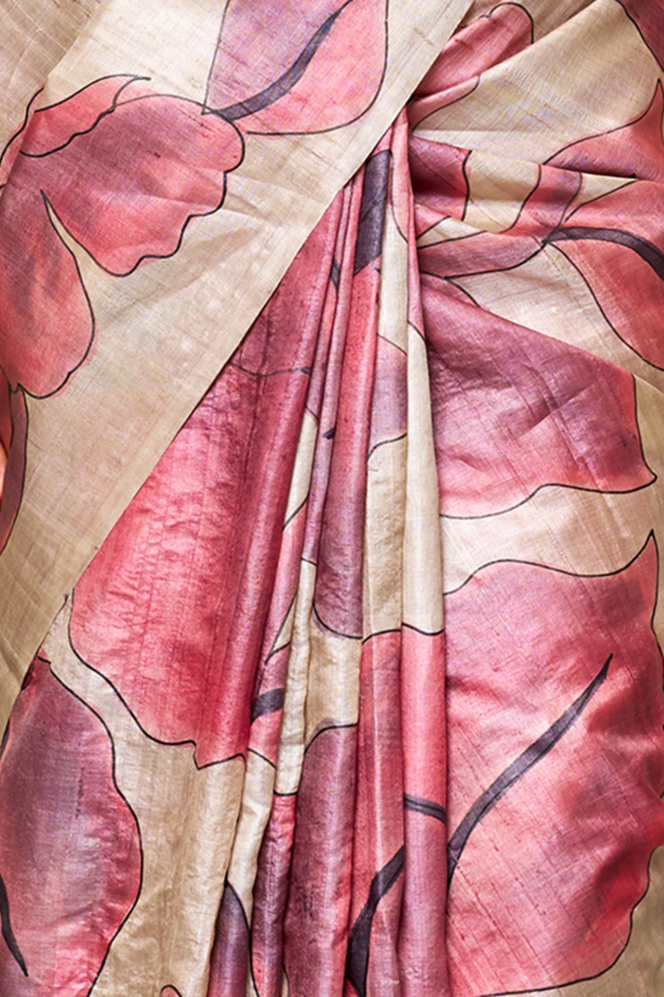 Created with refined, feather-light Tussar silk, this Warm beige-pink and Light warm grey saree features intricate floral motifs with a hand-painted look. Soft, breathable, and easy to drape, it offers timeless elegance for traditional functions, festive gatherings, and everyday wear.