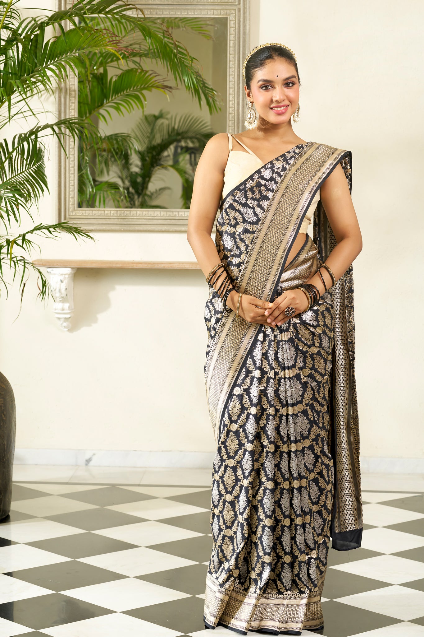 Crafted from Feather-light, this captivating Black Banarasi saree gleams with detailed silver and gold Zari embellishments woven across the body and pallu. Luxurious in feel and fluid in fall, it offers an ternal elegance ideal for occasions rooted in tradition and grace.
