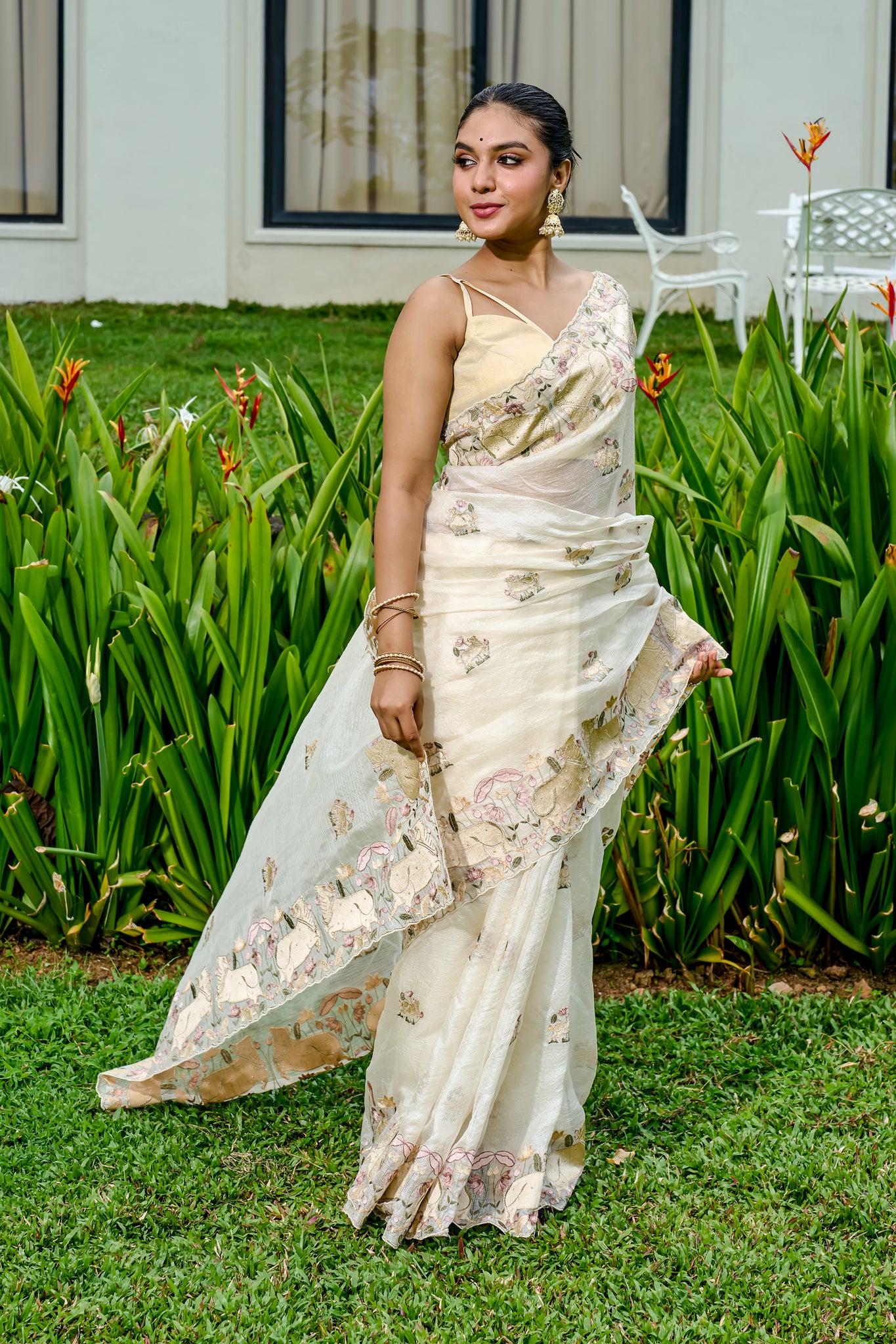 Styled in airy net-cotta fabric, this off-white saree features delicate machine embroidery on the body and pallu. Lightweight and graceful, it's an ideal pick for ceremonies and festive gatherings.