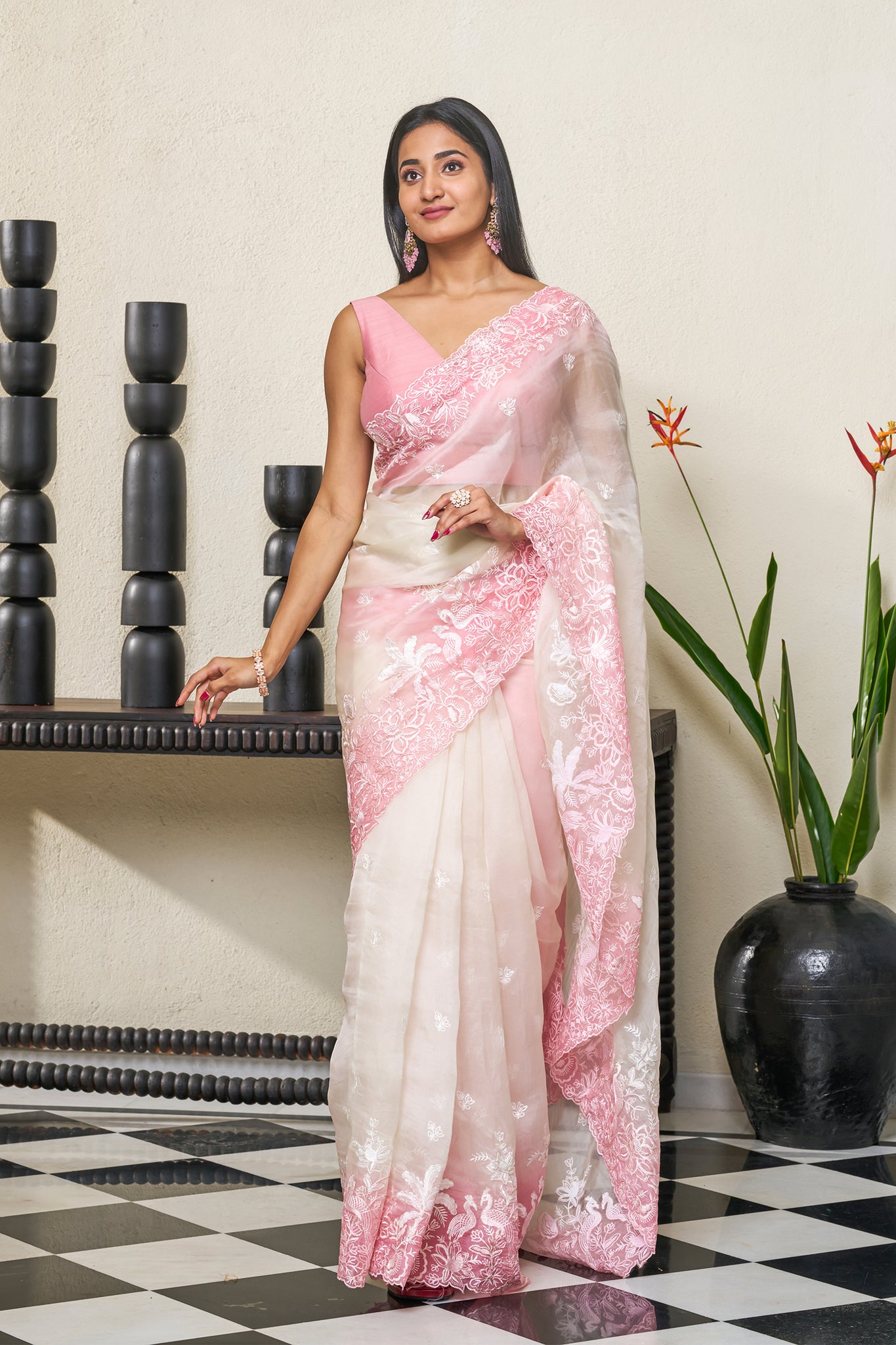 Crafted from lightweight organza, this saree exudes effortless elegance, making it an ideal choice for both party wear and light festive occasions. The border and pallu feature intricate heavy embroidery, adding a rich touch to the ensemble. Soft pink and white tones lend a delicate charm, while the sheer fabric offers a graceful, fluid drape.